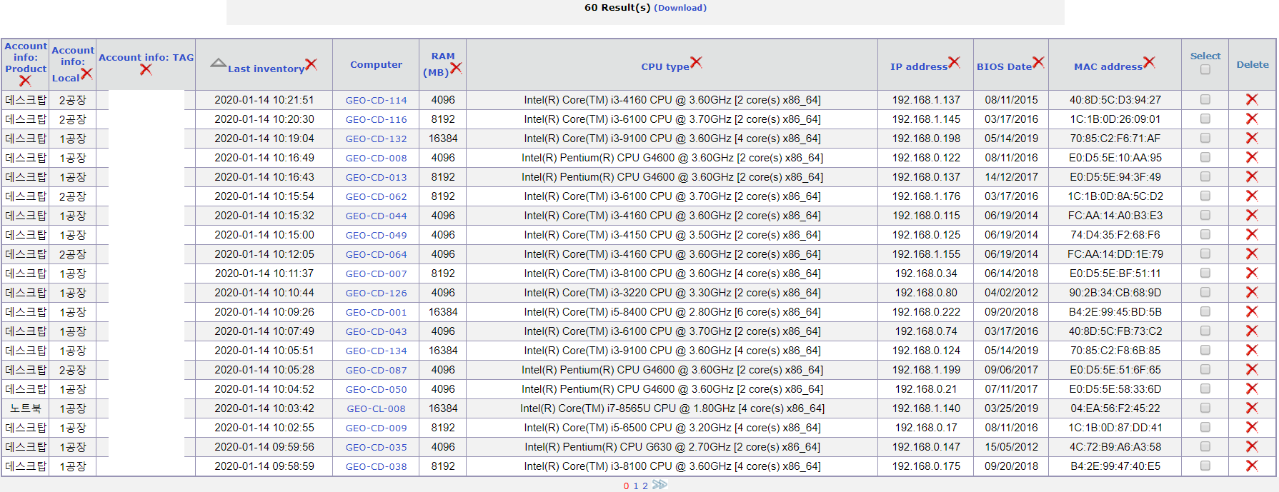 컴퓨터 별 정보를 넣을 때는 공장이 1,2 공장으로 나뉘어 있어서 크게 로컬로 1,2로 나누었고 데스크톱, 노트북, 베어본,으로 나뉘었습니다 컴퓨터명으로도 구분을 할 수 있지만 컴퓨터명으로 정렬을 해서 보지 못하기 때문에 정렬, 개수 파악을 위해 따로 정보를 기입했고, RAM, CPU, IP, MAC 그리고 바이오스 업데이트 날짜를 목록에 추가해 이 컴퓨터가 언제쯤 구매를 했고, 자산 부여를 할 때 날짜를 기입할 때 참고하여 부착할 수 있기 때문에 목록에 추가해 놓았습니다.