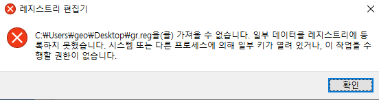 레지스트리로 등록하는 방법도 있지만 .reg 파일을 등록하게 되면 아래와 같은 오류가 뜨는데요