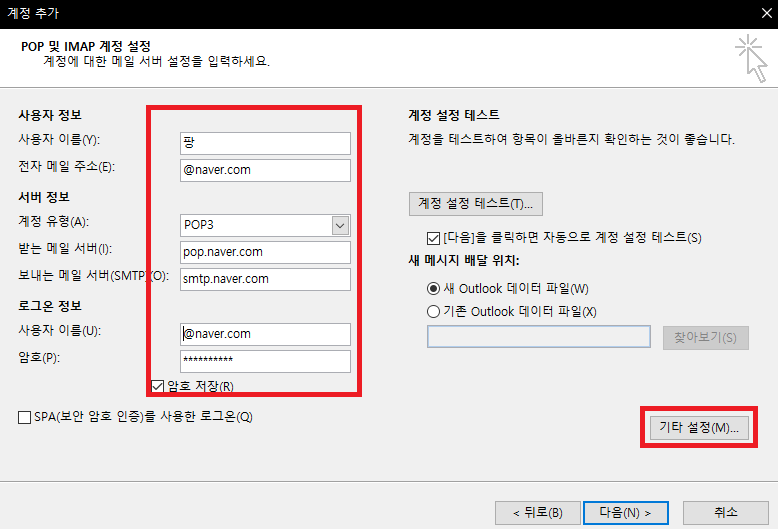그리고 다음부터는 순차적으로 따라해주세요 POP3 설정같은경우는 거의 비슷한 설정값이기 때문에