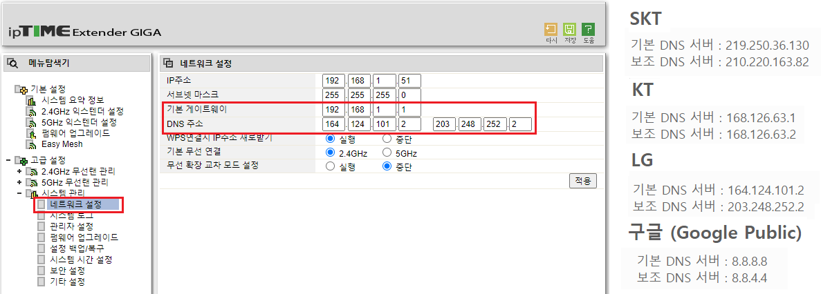 DNS는 자신의 인터넷 회사의 DNS를 넣어주시면 됩니다.