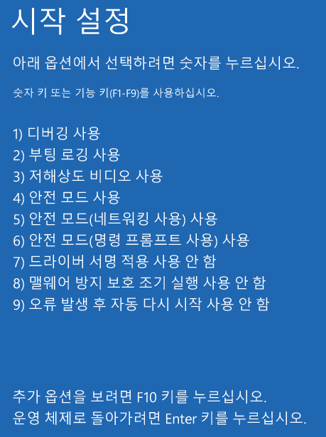 왼쪽 Shift 키를 누른상태 - 다시시작 - 파란화면에서 문제해결 - 고급옵션 - 시작설정 - 다시시작 - 진입모드 선택에서 4번키 |