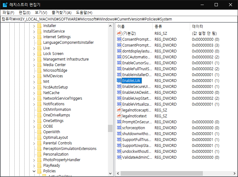 EnableLUA의 값을 16진수 0으로 변경 후 확인을 눌러준 후 재부팅하여 다시 확인해보세요