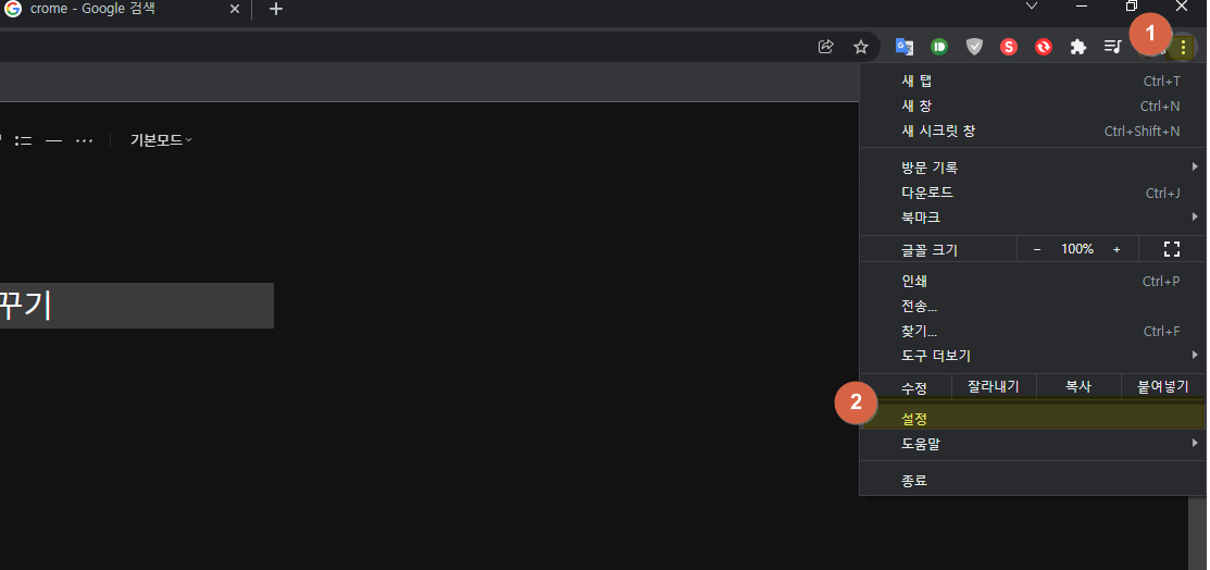 크롬 브라우저 실행 - ... 클릭 - 설정