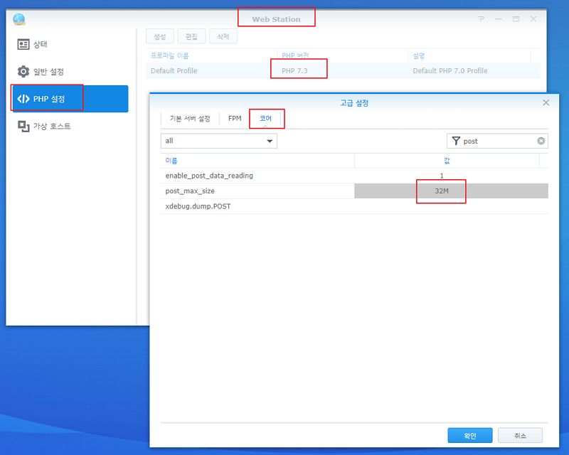 웹스테이션 → PHP 설정 → 사용중인 PHP 버전 클릭 → 코어 → 값 변경