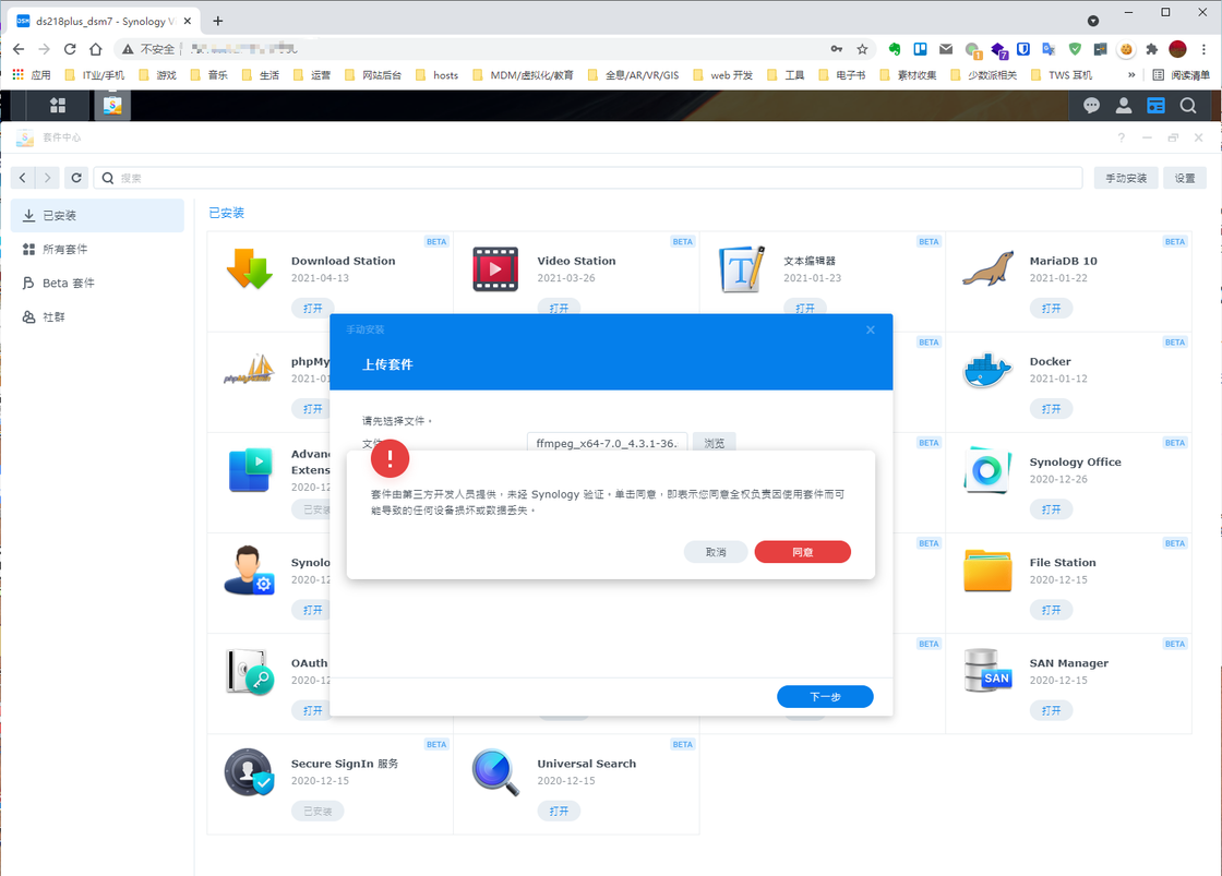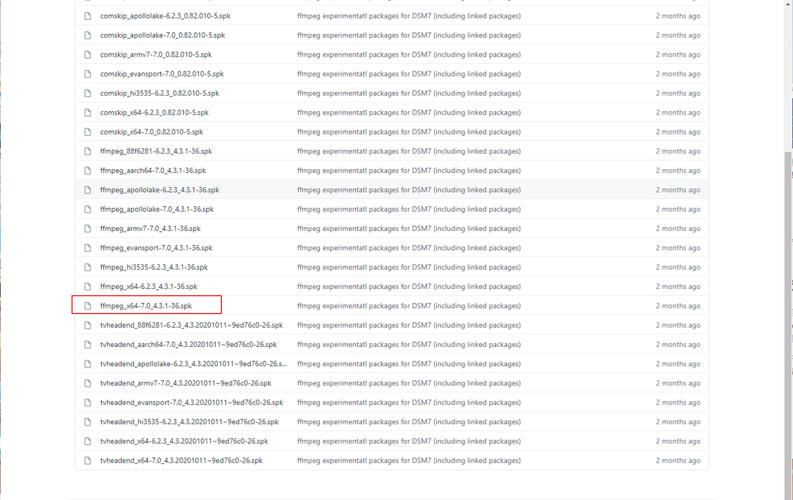 우선 , 여기에서 DSM 7.0용 타사 키트를 찾아 여기에서 찾은 것 ffmpeg_x64-7.0_4.3.1-36.spk(내 Synology는 x86-64 아키텍처를 기반으로 함)을 로컬로 다운로드해야 합니다.