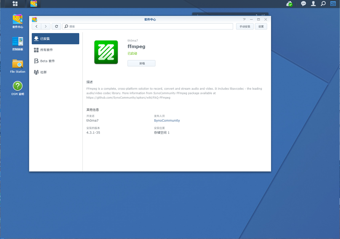 그런 다음 "패키지 센터 > 커뮤니티"에서 "ffmpeg" 패키지를 찾아 설치를 클릭합니다.