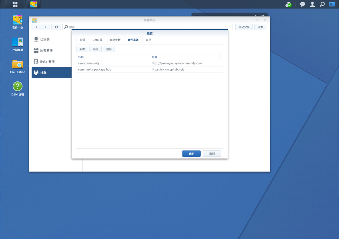 먼저 DSM의 "패키지 센터"에서 "설정"을 열고 "패키지 소스" 탭에서 커뮤니티 패키지 소스 synocommunity를 추가해야 합니다.http://packages.synocommunity.com
